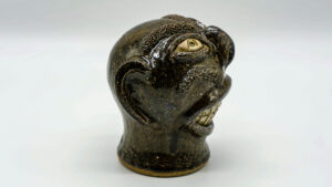 Finished with a rich surface treatment and fired in Steve’s ground-hog kiln, the figural head gains subtle variations in tone and texture from wood ash and flame. These natural kiln effects enhance the sculpted details and give each piece its own distinct presence.